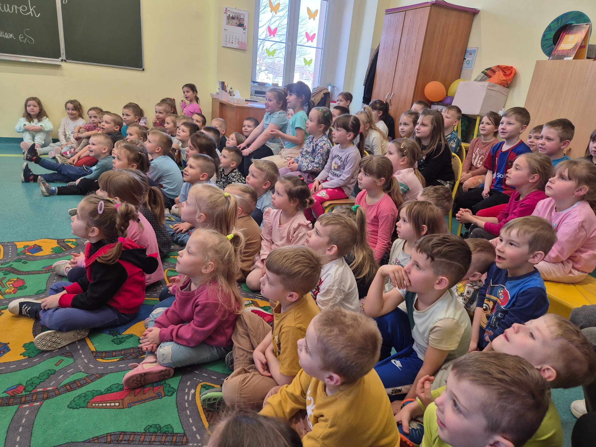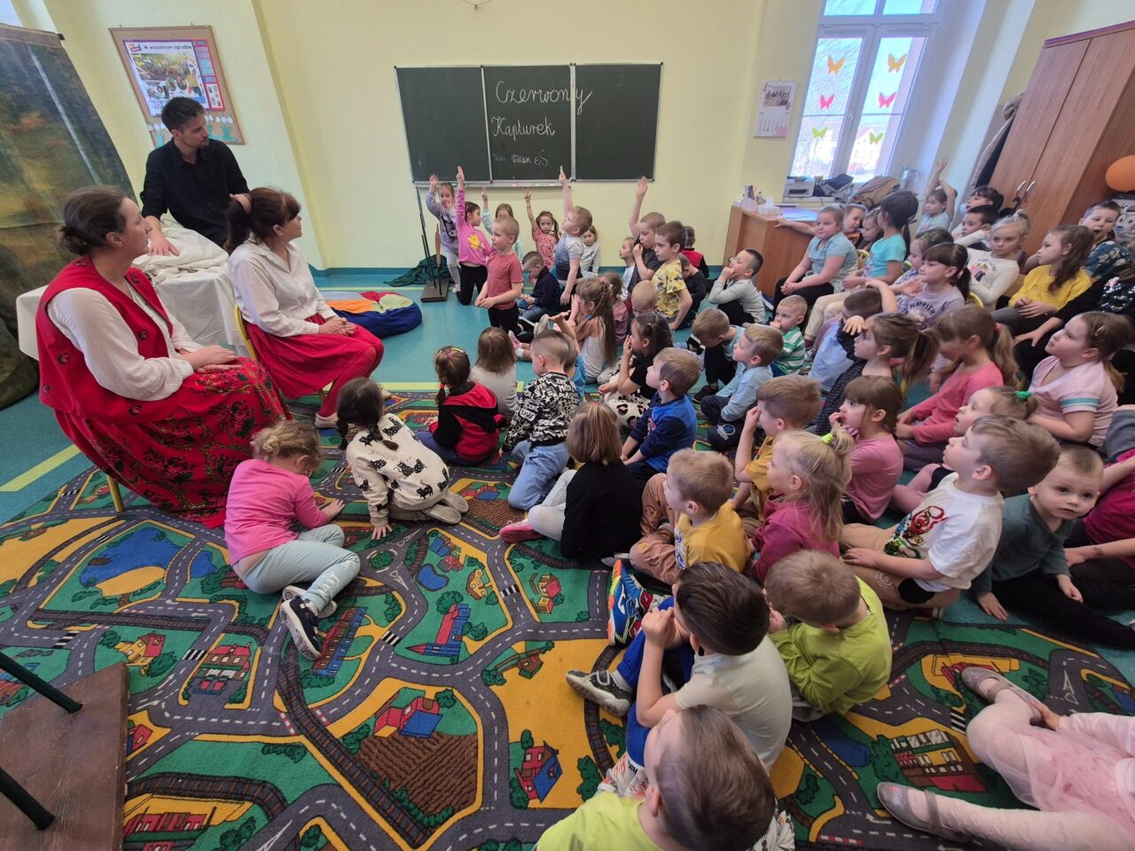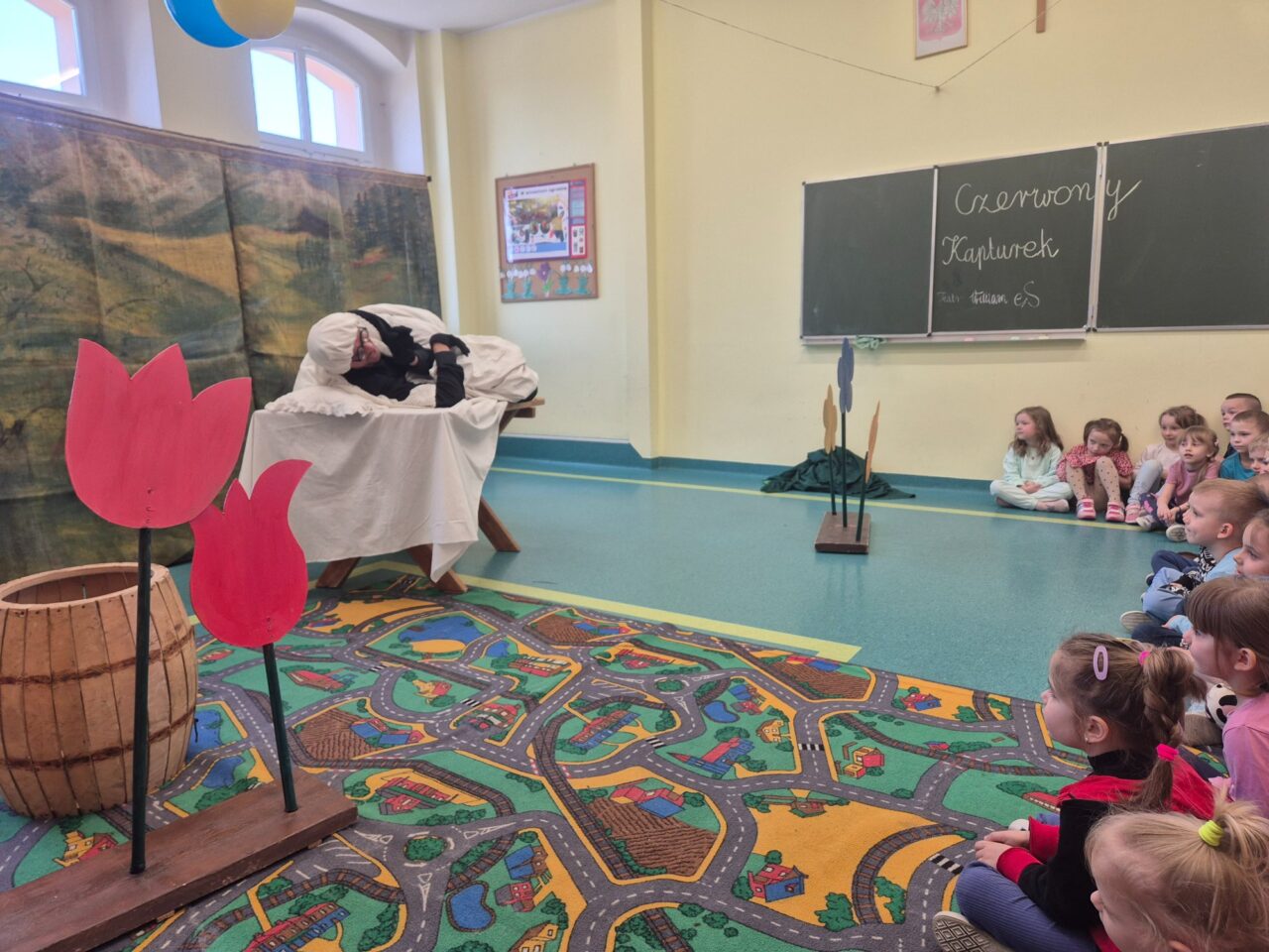 W dniu 28.03.2025r. z okazji Międzynarodowego Dnia Teatru przedszkolaki w naszym przedszkolu obejrzały spektakl „Czerwony Kapturek” w wykonaniu Teatru William Es. Po spektaklu odbyło się bardzo ciekawe spotkanie z aktorami, podczas którego dzieci mogły poznać szczegóły zawodu aktora.