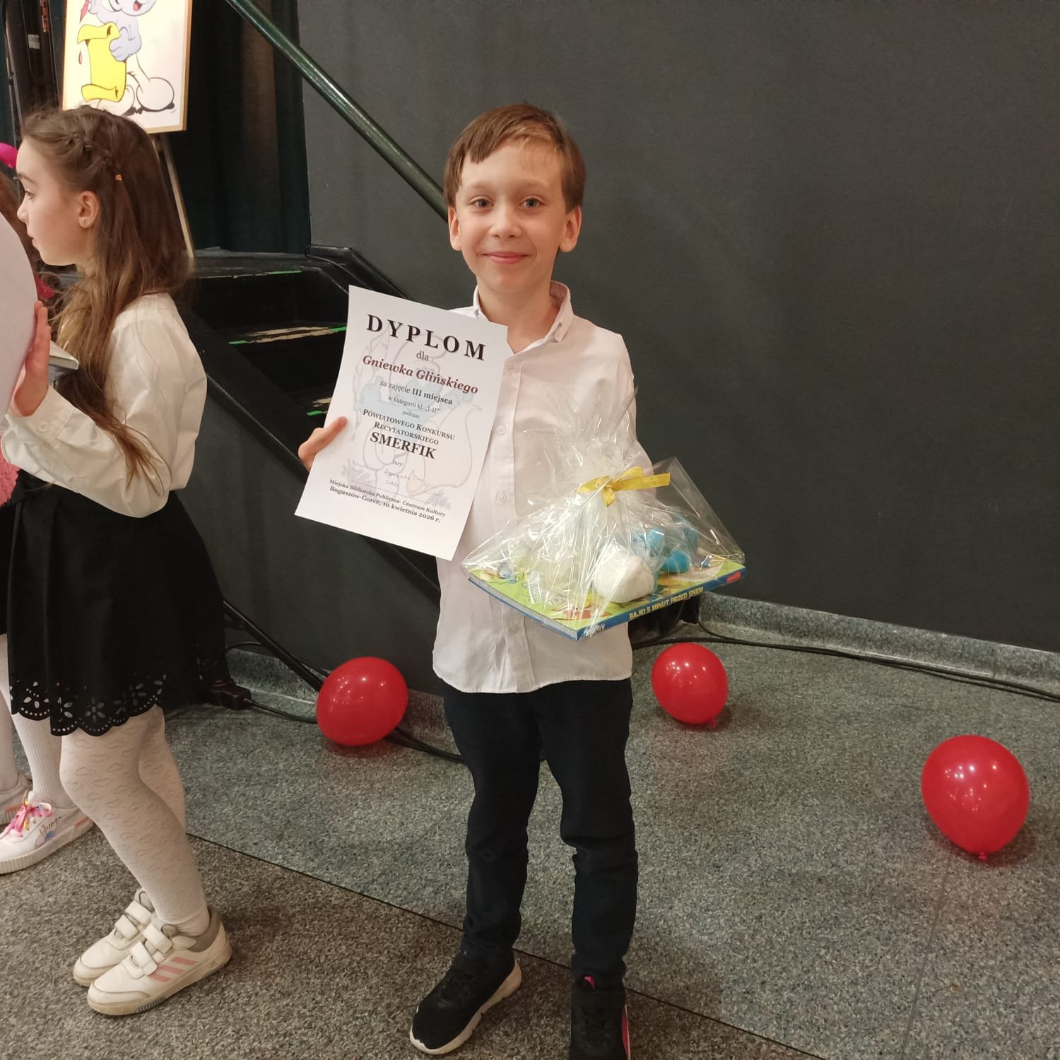Dnia 10 kwietnia 2026 r. dwoje uczniów reprezentowało naszą szkołę w Powiatowym Konkursie Recytatorskim „ Smerfik” organizowanym przez miejską Bibliotekę Publiczną- Centrum Kultury w Boguszowie Gorcach. Uczeń klasy II b Gniewko Gliński brawurowo wykonał wiersz „ Bziki Weroniki” Agnieszki Frączek i zajął III miejsce w kategorii uczniów klas II-III. Gratulujemy i życzymy dalszych sukcesów.